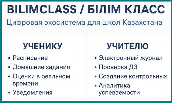 BilimClass — или, как его часто называют в казахстанских школах, білім класс — это современная цифровая платформа, созданная для удобного управления учебным процессом. Система объединяет электронный дневник, журнал, расписание, инструменты для дистанционного обучения и полный набор сервисов для школ.